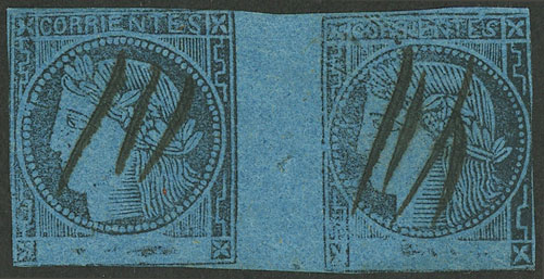 different and varied pen cancels on Corrientes stamps, with their particular features, and inks applied at each post office. Using his own classification, the author seeks to unpack the characteristic strokes of each town of the province, between the