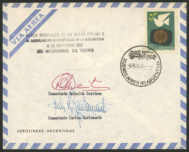 First overflight of a Boeing 707-387 B of Aerolíneas Argentinas in Antarctica, cover with special handstamp and signed by the Commander of the flight, rare, ONLY 20 are known! (Image)
