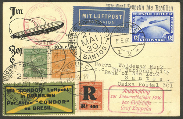 Brazil + Germany MIXED POSTAGE: Postcard sent by Zeppelin from Berlin (19/MAY/1930) to Santos, franked with 2Mk. (Sc.C38) + Brazilian stamps of Syndicato Condor (Sc.1CL2, 1CL4 and 1CLF1), varied cancels, it arrived in Santos on 27/MAY,