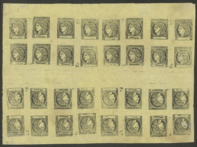 yellow, complete sheet of 32 stamps, composition 2, disposition I, with traces of the screws that hold the 4 groups of 8 types, with a minor crease of little importance, very nice, low start! (Image)