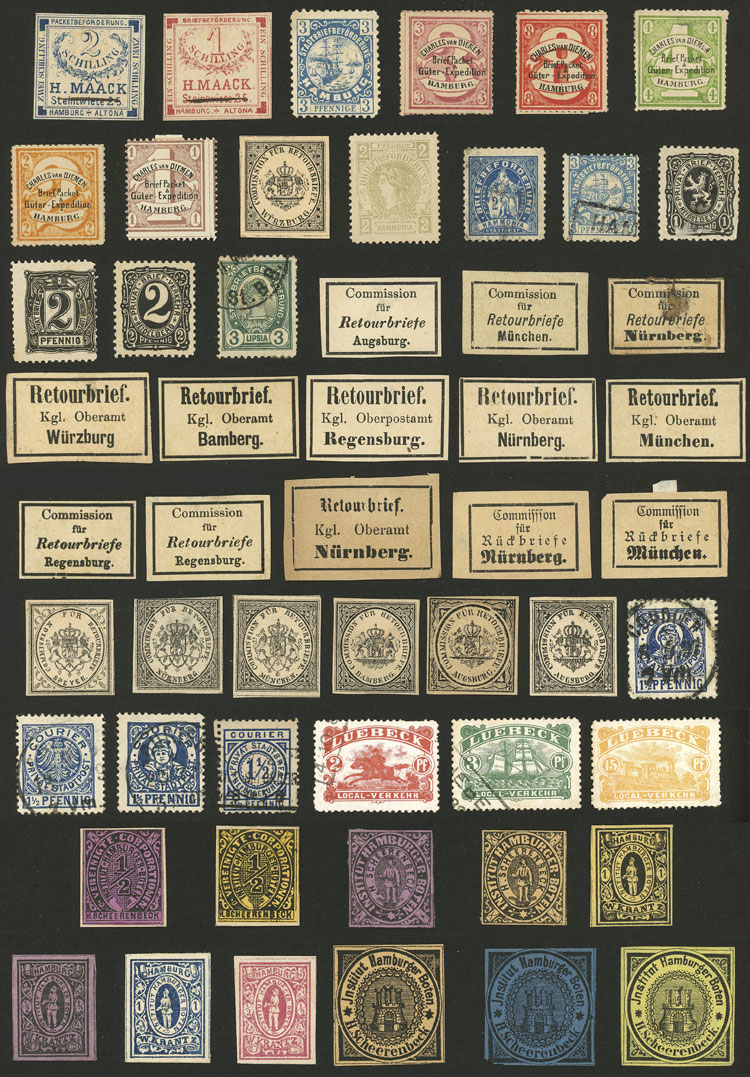over 50 private posts stamps and returned mail labels, most mint without gum, in general of VF quality, unusual lot! (Image)