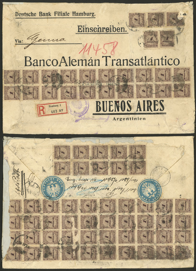 POSTAGE: Registered cover sent from Hamburg to Buenos Aires in NO/1923 franked (on front and back) with 75 stamps of 1,000,000,000Mk (Sc.295), total postage 75 thousand million Marks!!, with some defects (about 10 stamps are damaged), but spectacular