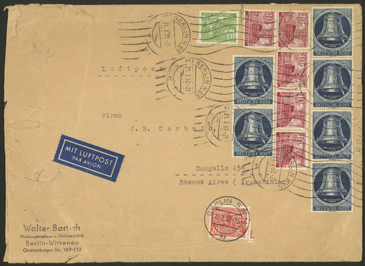 Airmail cover sent to Buenos Aires on 21/JUL/1952 with spectacular franking of 4.10Mk., very attractive! (Image) (Image-02)
