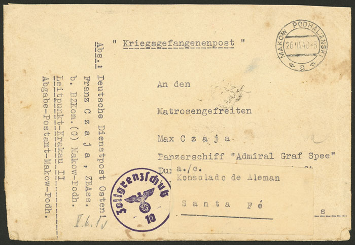SAILORS OF BATTLESHIP GRAF SPEE: Cover sent on 6/MAR/1940 from Makow Podhalanski to Argentina with postal franchise of prisoners of war, to sailor Max Czaja originally to the German Embassy in Buenos Aires and then forwarded to the German