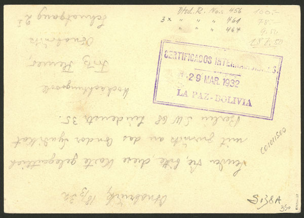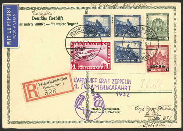 31/MAR/1932 Friedrichshafen to La Paz (Bolivia), card sent by Zeppelin by registered mail, with special handstamp and arrival backstamp of 29/MAR, VF and unusual destination! Ex-Loeb (its selling price was US$350) (Image) (Image-02)