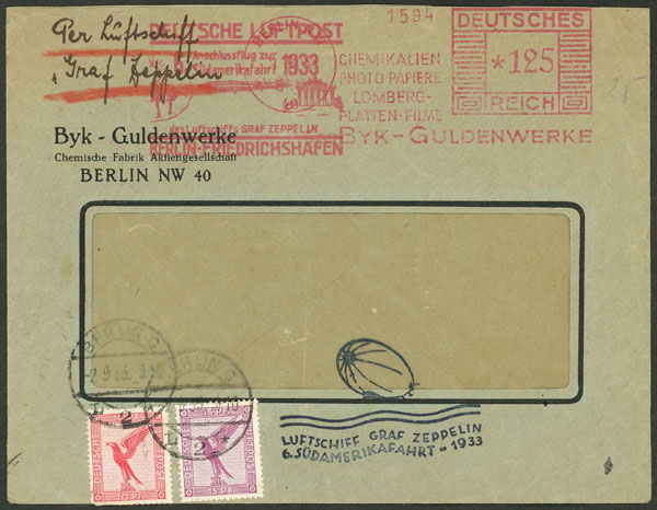 2/SE/1933 Berlin to Brazil, commercial cover flown by Zeppelin, with mixed meter postage (1.25Mk.) + postage stamps (25Pg.), arrival backstamp, VF!