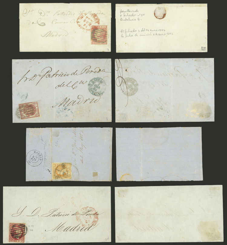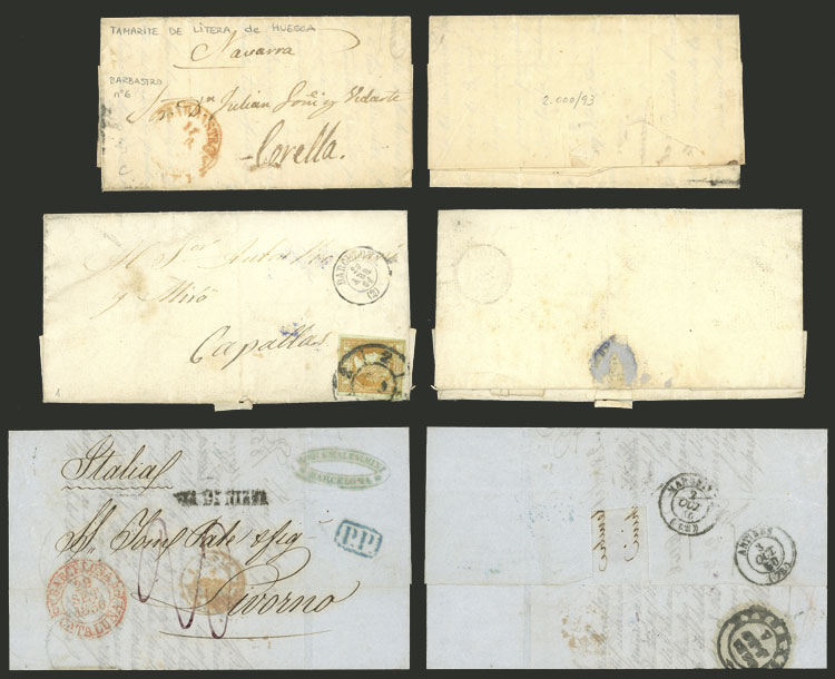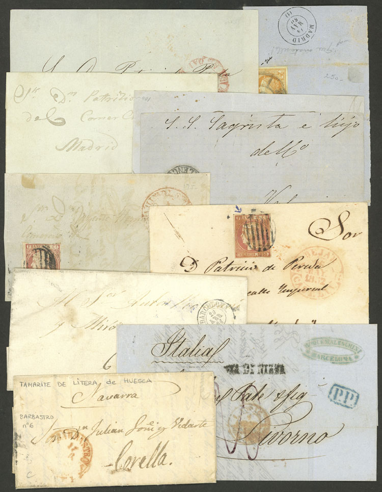 1850 to 1864, lot of 9 letters or fronts + one large fragment, varied frankings and cancellations, nice lot! The lot features an entire letter from Huesca to Corella and one from Barcelona to Livorno with "VIA DE NIZZA" mark, very
