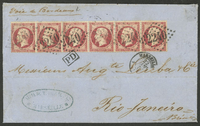 22/JA/1864 Marseille to Rio de Janeiro, entire letter with spectacular postage of 4.80Fr. (6th rating), excellent quality, with certificate of A. Roumet
