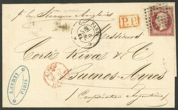 6/JUL/1864 Paris to Buenos Aires, folded cover franked with 80c. sent by "English steamer", transit mark of London 8/JUL, very fine quality! (Image)