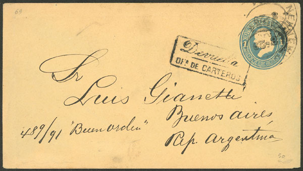 1c. Stationery envelope sent from New York to Argentina and returned to sender with rectangular mark applied in Buenos Aires: "Devuelta - OFa. DE CARTEROS", handwritten note on back: "No conocen - 26", excellent! (Image) (Image-02)