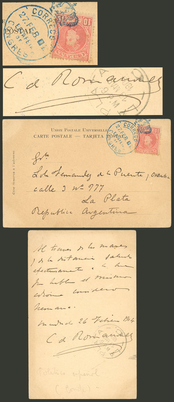 sent from Madrid to Argentina on 27/AP/1904 franked with 10c. and beautiful blue cancel of "Estafeta del Congreso"; it was sent by the COUNT OF ROMANONES (politician of the Liberal Party, poet, etc.), with his hand-written signature, excellent
