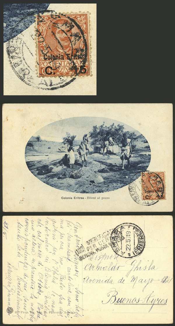 DESTINATION: Postcard sent from Asmara to Argentina on 22/MAY/1919 franked with 15c. (Sc.34), excellent quality, rare! (Image)