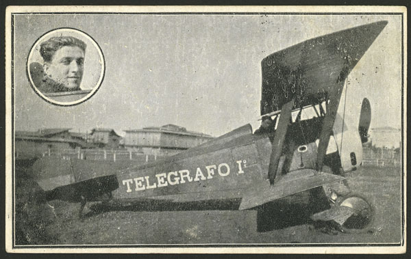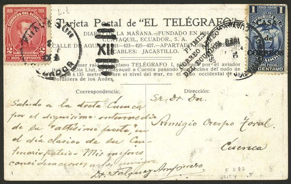 4/NO/1920 Guayaquil - Cuenca, first airmail of Ecuador, card with view of "El Telégrafo I" airplane and of Italian pilot Elia Liut, with the 3-line special mark, excellent quality, rare! (Image) (Image-02)