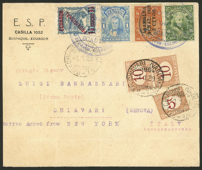 7/DE/1928 Guayaquil to Italy, interesting cover carried by SCADTA, with multicolor postage including Sc.C4 (1½S. on 30c.), on back transit mark of Barranquilla and arrival. On arrival it received postage due stamps for 25c., VF quality! (Image) (Image-02)