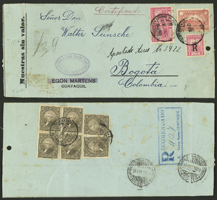 12/AU/1929 Guayaquil to Bogotá (Colombia), cover that contained "samples without value" sent by registered mail with large postage of 13.30S. (including Scott C23 + CF2), very fine quality, rare! (Image)