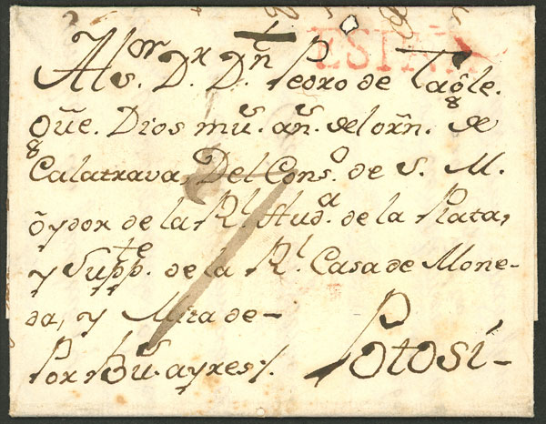 sent to Potosi (Bolivia) via "Buenos Ayres", with the red mark "ESPAÑA" applied on arrival in B.Aires and "7" rating in pen, excellent quality, rare!! (Image)