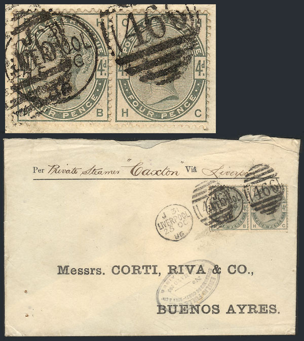 25/OCT/1886 LIVERPOOL - Buenos Aires: Cover franked by pair Sc.103, duplex cancel and Buenos Aires arrival backstamp of 26/NO, VF quality! (Image) (Image-02)