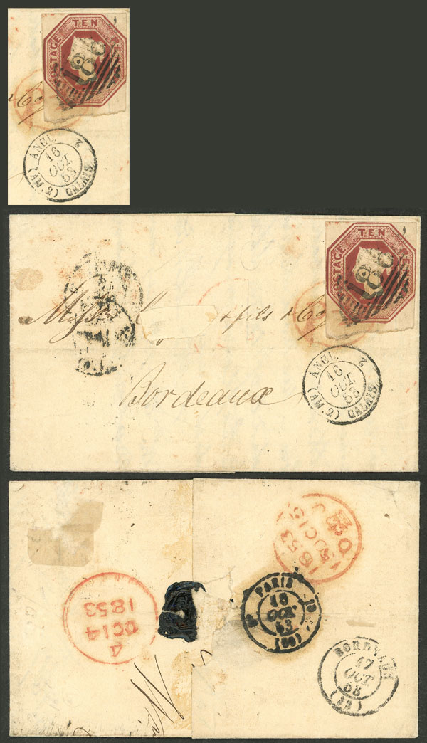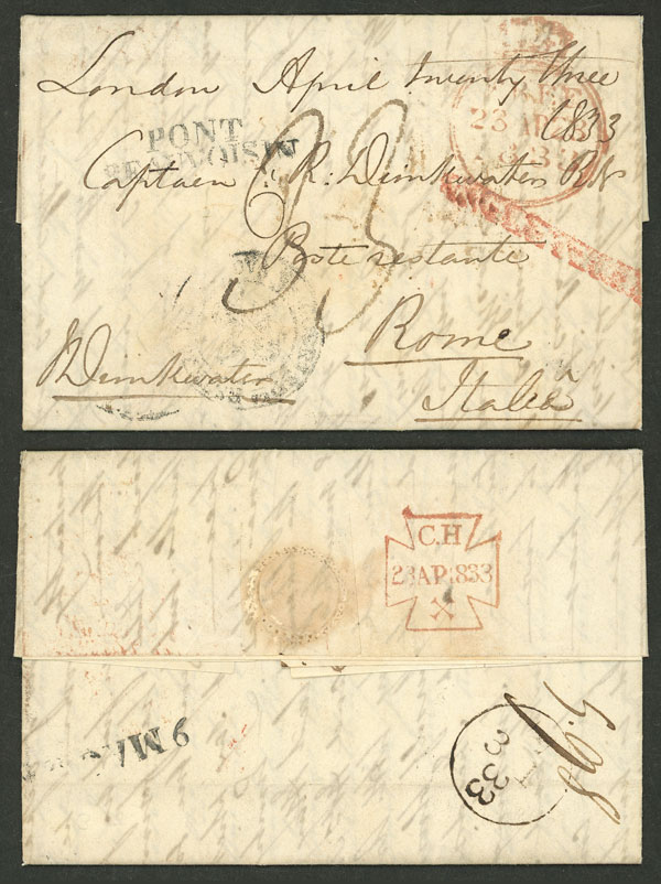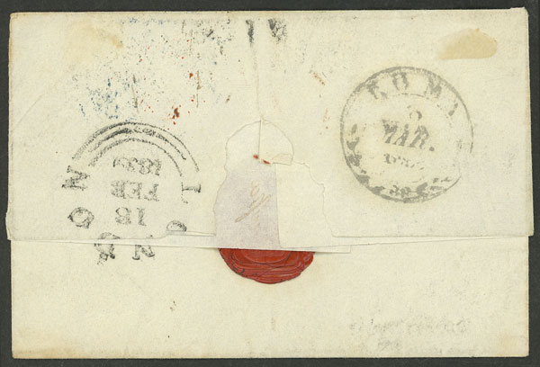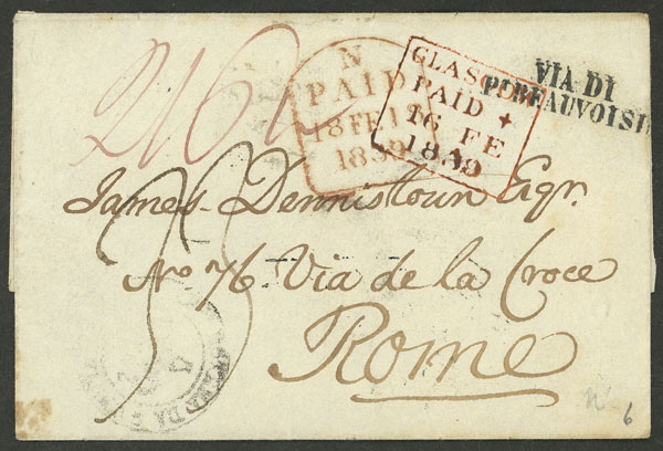 16/FE/1839 Glasgow (Scotland) to Roma, folded cover with interesting marks on front and back, including "VIA DI Pt. BEAUVOISIN" and "CORRISPa. ESTa DA GENOVA" (on front, faint), very fine quality! (Image) (Image-02)