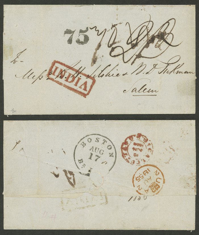 16/JUN/1855 Calcutta to Salem (USA), folded cover sent to be paid by the recipient, transit marks of London and Boston and various charges, VF quality!
