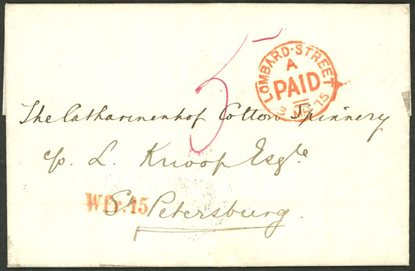 3/MAR/1875 London to St. Petersburg, entire letter with mark of "LOMBARD STREET - PAID", arrival backstamp, excellent quality! (Image) (Image-02)