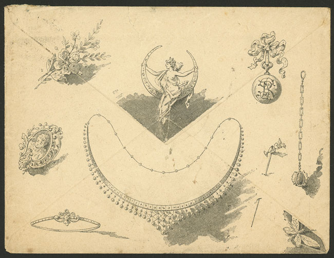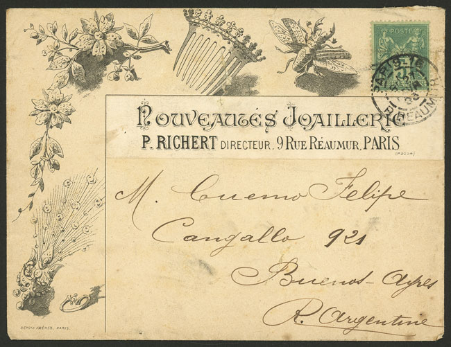 Cover decorated with splendid impression on front and back with JEWELRY motif, sent from Paris to Buenos Aires on 27/FE/1893 franked with 5c., small defects almost of no importance, excellent appearance, very attractive! (Image) (Image-02)
