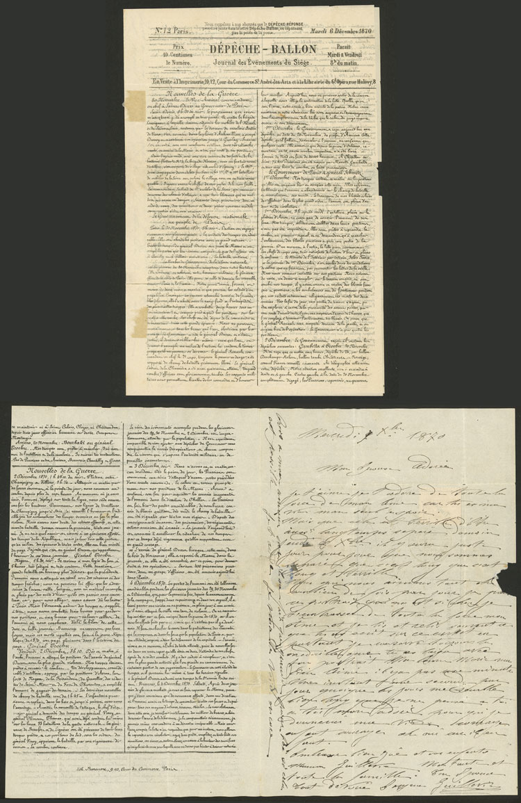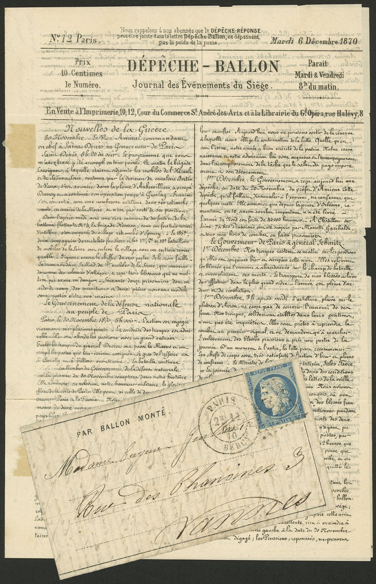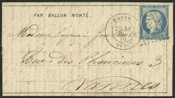 BALLON MONTÉ: Printed note + hand-written letter sent to Vannes on 11/DE/1870 franked with 20c., very fine quality! (Image) (Image-02)