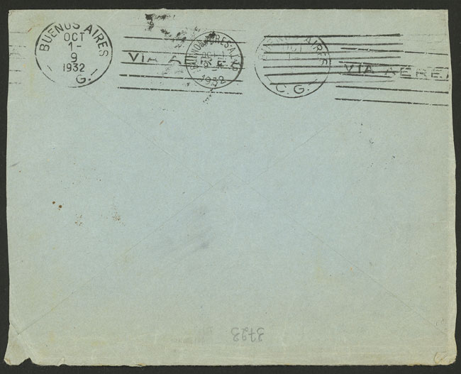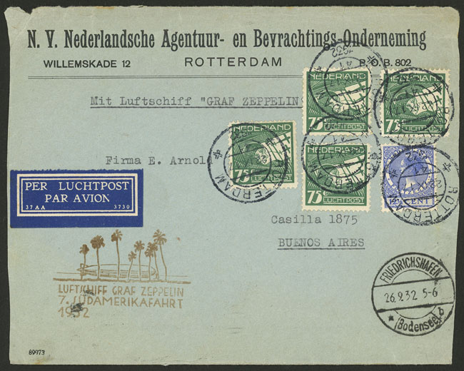 22/SE/1932 Rotterdam to Buenos Aires, cover carried by Zeppelin on 7th flight to South America, with transit mark of Friedrichshafen 26/SE and arrival of 1/OC, very attractive! (Image) (Image-02)