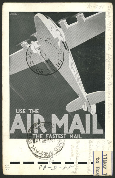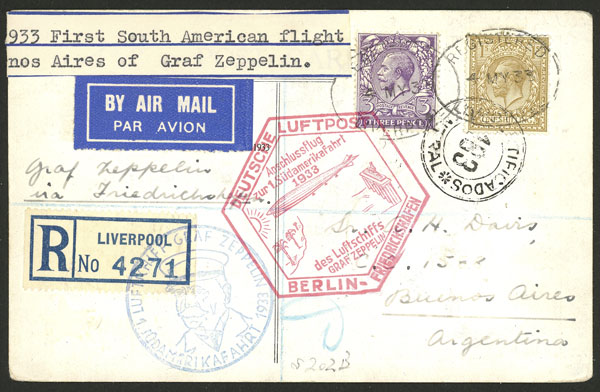4/MAY/1933 Liverpool to Buenos Aires, postcard sent by registered mail via Zeppelin, special markings and on back arrival mark of 11/MAY, excellent quality. Ex-Loeb (its selling price was US$390) (Image) (Image-02)