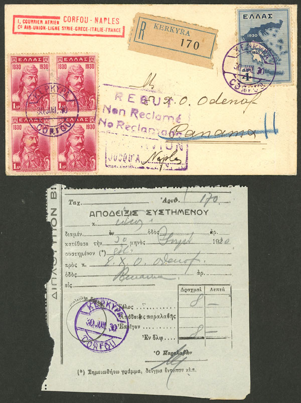 30/JUL/1930 Corfu to Panama, registered cover flown on the first flight between Corfu and Napoli, final destination Panama and returned to sender, including the original receipt of the cover, excellent quality! (Image) (Image-02)
