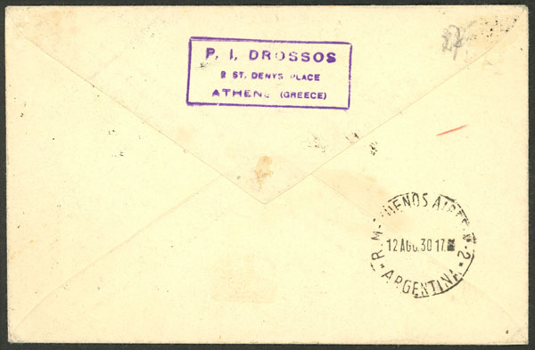 30/JUL/1930 Athens to Buenos Aires, first flight of the C.G.A., with (faint) violet diamond mark "Primer correo aéreo entre Grecia y Sudamérica", on back arrival mark of B.Aires 12/AU, very interesting! (Image) (Image-02)