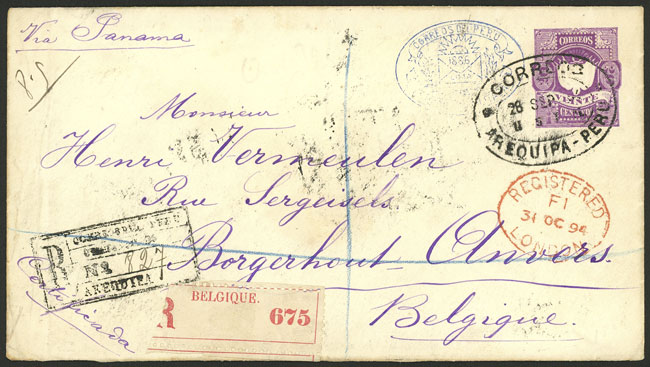20c. Stationery envelope + additional 1c. on back, sent by registered mail from Arequipa to Belgium on 28/SE/1894, arrival backstamp of Anvers 1/NO, excellent quality! (Image) (Image-02)