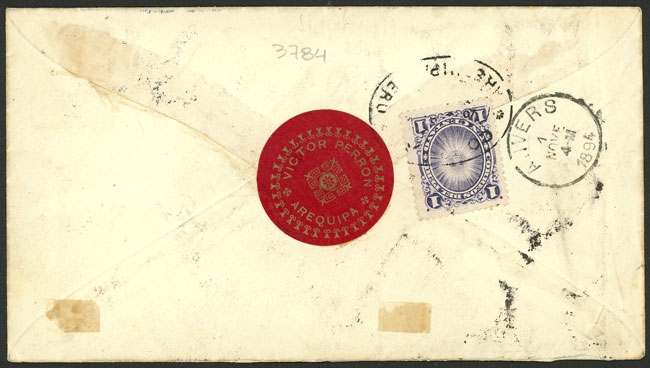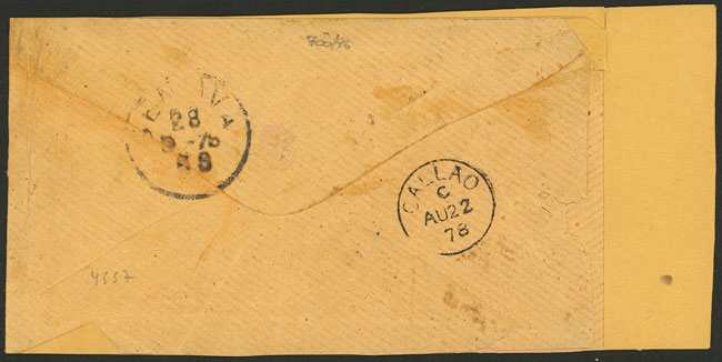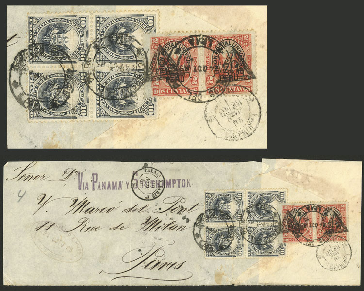 QUADRUPLE RATING TO FRANCE: Cover sent from Lima to Paris on 24/OC/1885 franked with 44c., arrival mark of 29/NO, excellent quality, ex-Herbert Moll. NOTE: Part of the postage was on the back, so it was opened to make it fully visible. (Image) (Image-02)