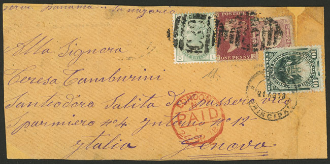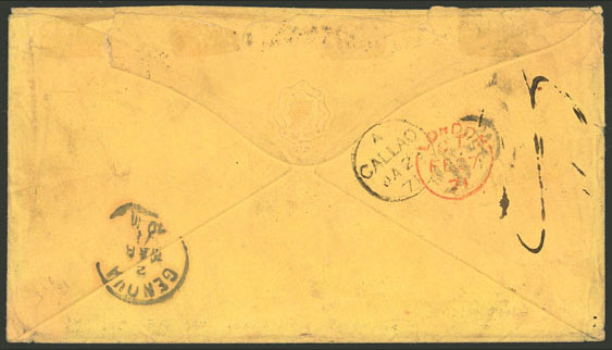 21/AU/1878 Lima to Genova, cover franked with Peruvian postage of 10c. + English postage of 1S.1½p. to pay the rate to Europe applied at the Consular agency in Callao, the additional value of 1½p. was to pay the transit to Italy, with