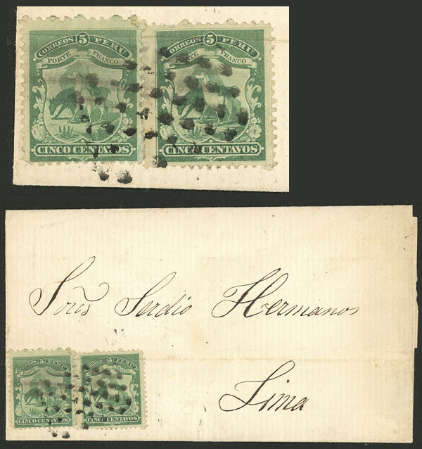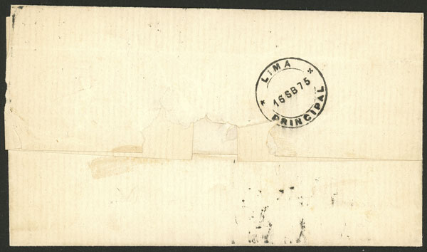 Folded cover sent from Pisco to Lima on 15/SE/1875 franked 10c. with two "Llamas" of 5c. (Sc.16), mute cancel and on back receiving datestamp of 16/SE, fine quality, ex-Herbert Moll (Image) (Image-02)