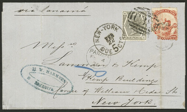 back there is a datestamp of Callao 26/JA, also transit mark of Panamá 4/FE, arrival and 5c. dues of New York for 22/FE. The Peruvian stamp of 10c. is defective, the rest excellent and fresh, very rare! Ex-Herbert Moll (Image) (Image-02)