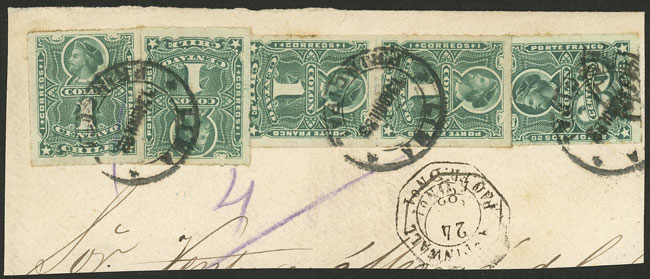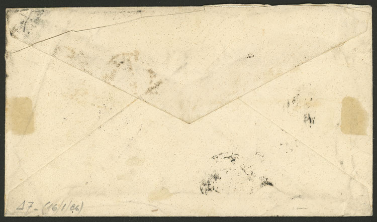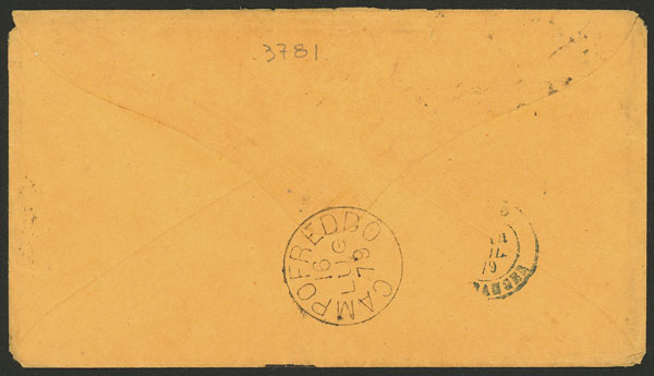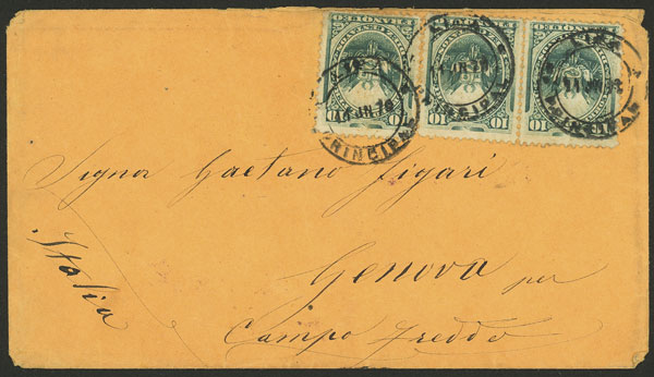 6/JA/1885 ICA to Lima during the civil war, cover franked with 20c. (strip of 4 of the 5c. blue with ICA overprint in oval, Sc.16N5), and Lima arrival mark for the following day. Some experts have told me that these overprints are at