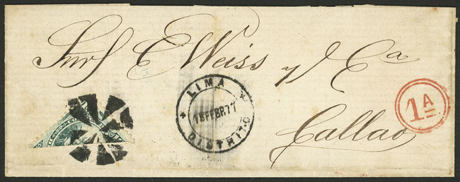 16/FE/1877 Lima to Callao, cover franked with 5c. using a bisect stamp of 10c. (Sc.26a) with mute "8 wedges" cancel perfectly applied, datestamp of Lima, red mark indicating "primera distribución", and on back datestamp of Callao (same