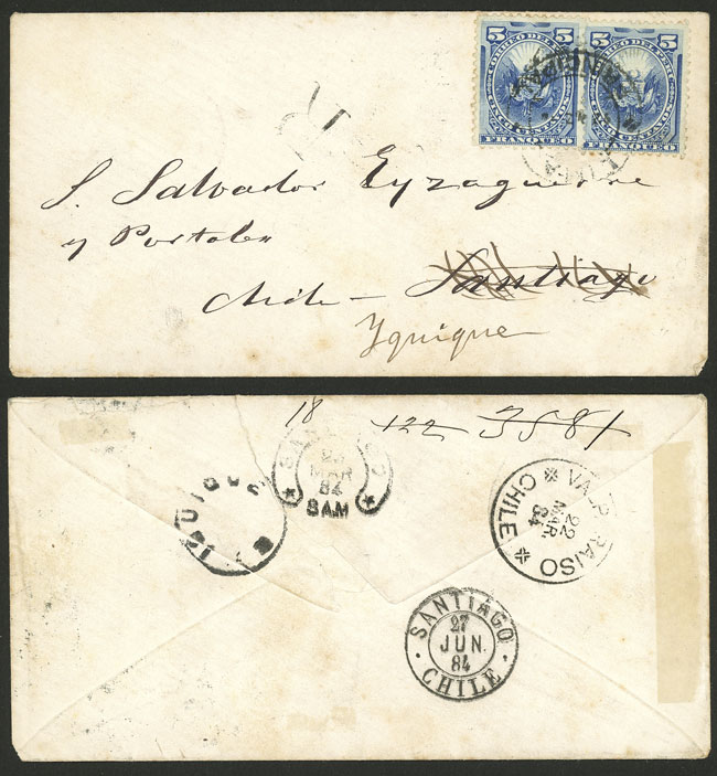 COVER SENT TO IQUIQUE franked with 10c. with datestamp of Lima 14/MAR/1884 and sent originally to Santiago and then forwarded to Iquique, on back there are marks of Valparaiso 22/MAR, Santiago 23/MAR, Santiago 27/JUN, and Iquique (without date), very