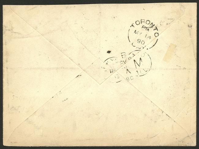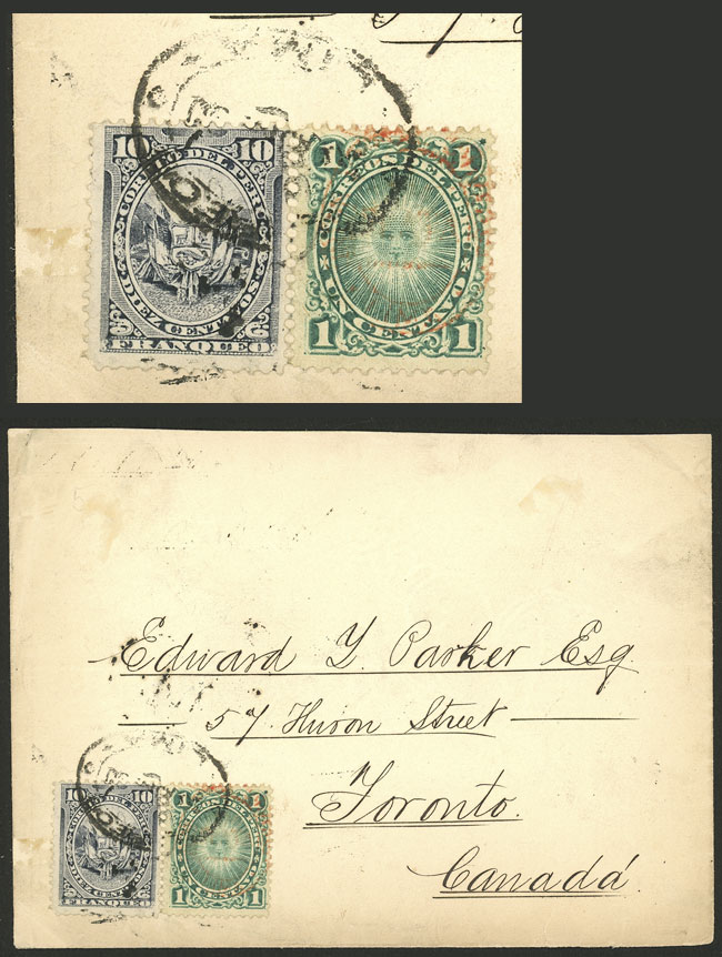 AP/1890 Lima to Toronto (Canada), cover franked with 11c. combining one stamp of 1c. overprinted "UPU PLATA LIMA" in red (Sc.38, very rare used on cover) and a 10c. Coat of arms, without grid (Sc.110), arrival backstamp, excellent