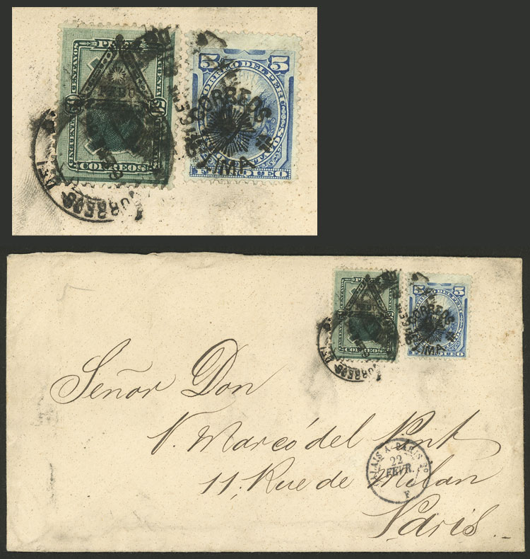 QUINTUPLE RATING and spectacular postage combination: Cover sent from Lima to Paris on 16/JA/1886 franked 55c. with a stamp of 50c. with triangular overprint (Sc.71) + 5c. overprinted "sun and CORREOS LIMA" (Sc.103), arrival mark of