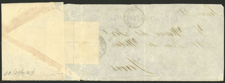 Front of a printed circular sent from Lima to Paris on 14/AP/1885 franked with 2c. with "triangular" and "horseshoe" overprints (Sc.88 ALONE), unusual rate, rare, ex-Herbert Moll. (Image) (Image-02)