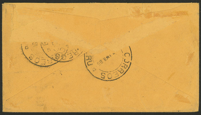 Registered cover sent from YCA to New York in AU/1885 franked with 21c. including a pair of 5c. with magenta "YCA" overprint and 1c. orange with "triangular" overprint, on back transit mark of Lima 8/AU and New York arrival of 3/SE,