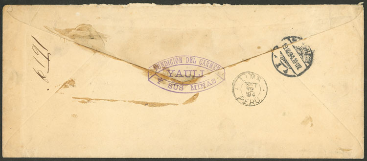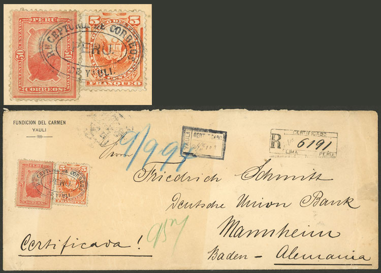 12/SE/1894 YAULI to Germany, registered cover franked with 55c. and splendid postmark of Receptoría de Yauli, also bearing transit mark of Lima 12/SE/1894 and Mannheim arrival 19/OC, very fine quality, rare, ex-Herbert Moll. (Image) (Image-02)