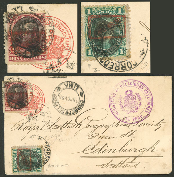 18/NO/1895 Lima to Scotland, official cover with postage of printed matter for 3c. (Sc.O9a with the overprint of Bermúdez inverted + O11), very fine quality, ex-Herbert Moll. (Image) (Image-02)