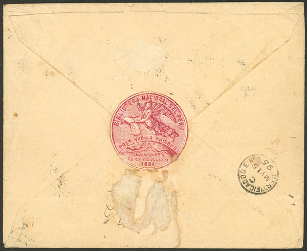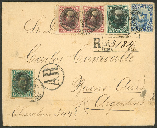 20/AP/1895 Lima to Argentina, registered cover with AR, franked with 35c. (20c. for a double-rate letter + 10c. registratoin + 5c. for AR), arrival backstamp, VF quality, rare! (Image) (Image-02)