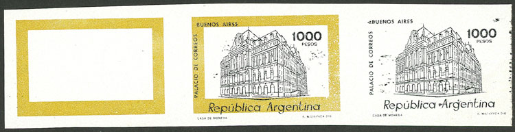 PROOF: GJ.1850, 1979/82 1,000P. General Post Office, imperf strip of 3, the first one only with the ocher frame printed, the middle example complete, and the right one only with the black vignette, excellent and very rare! (Image)