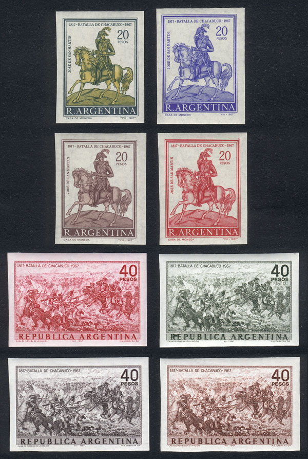 (Sc.843/4), 1967 Battle of Chacabuco, 4 TRIAL COLOR PROOFS of each value, imperforate on normal paper with gum and watermark, superb, very rare! (Image)
