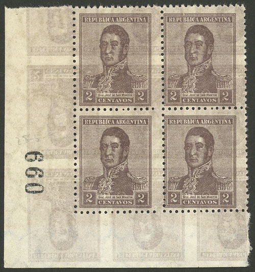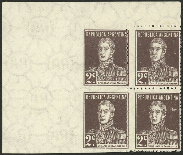 1917 2c. San Martín perf 13½, corner block of 4 with DOUBLE IMPRESSION variety, one inverted, spectacular and of excellent quality! NOTE: This variety is not yet catalogued (in this perforation) and it will be included in the next edition of the GJ