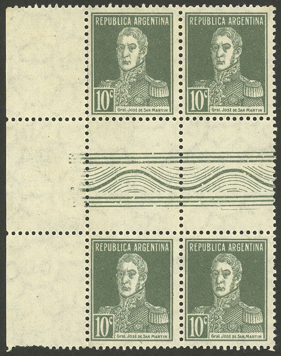 GJ.600EHA, 10c. San Martín w/o period, block of 4 with fancy horizontal GUTTER, MNH (+50%), superb, very rare! (Image)