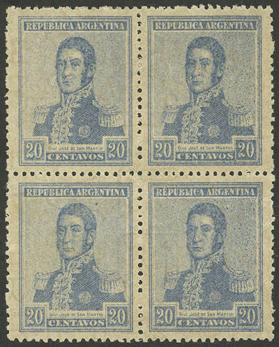 1918 20c. San Martín with Wheatley Bond wmk, block of 4, ALL THE STAMPS WITH WATERMARK, very rare, VF, catalog value US$400 (Image)